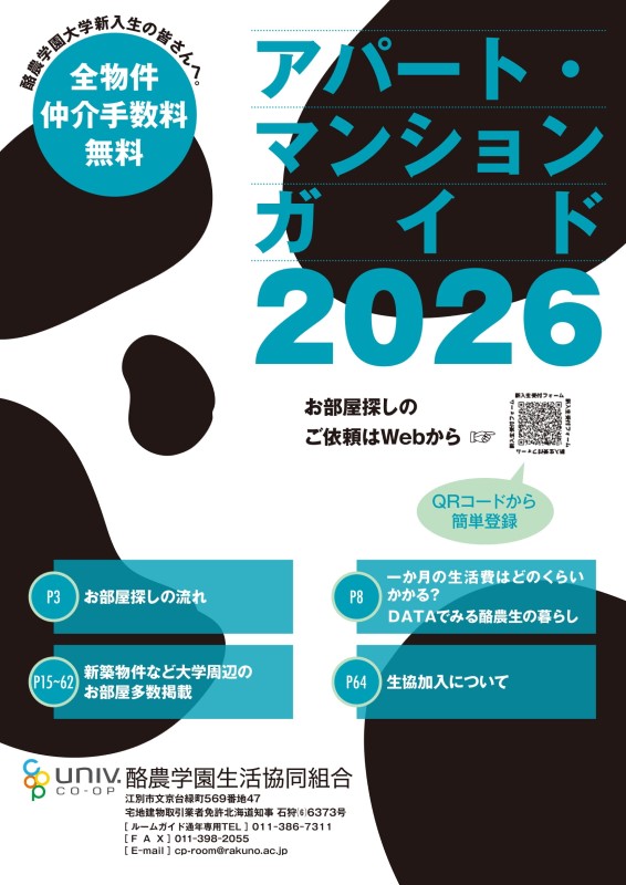 新入生の皆さま向けに、酪農学園周辺にあるアパート・マンション・食事付き学生会館のほとんどを網羅し掲載した空室情報誌【アパートマンションガイド2026】をご請求の方にお送りします。(送料共無料)